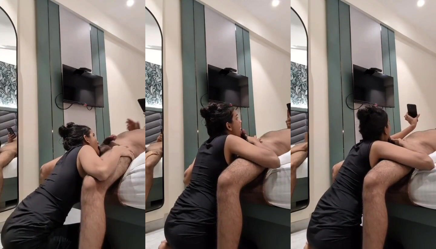 An Indian Aunty is sucking her lover’s dick in a hotel room. She is in a formal one-piece dress, kneeling near the bed to give a blowjob. See how she licks his balls before sucking his dick while her lover is taking a selfie of the steamy session.